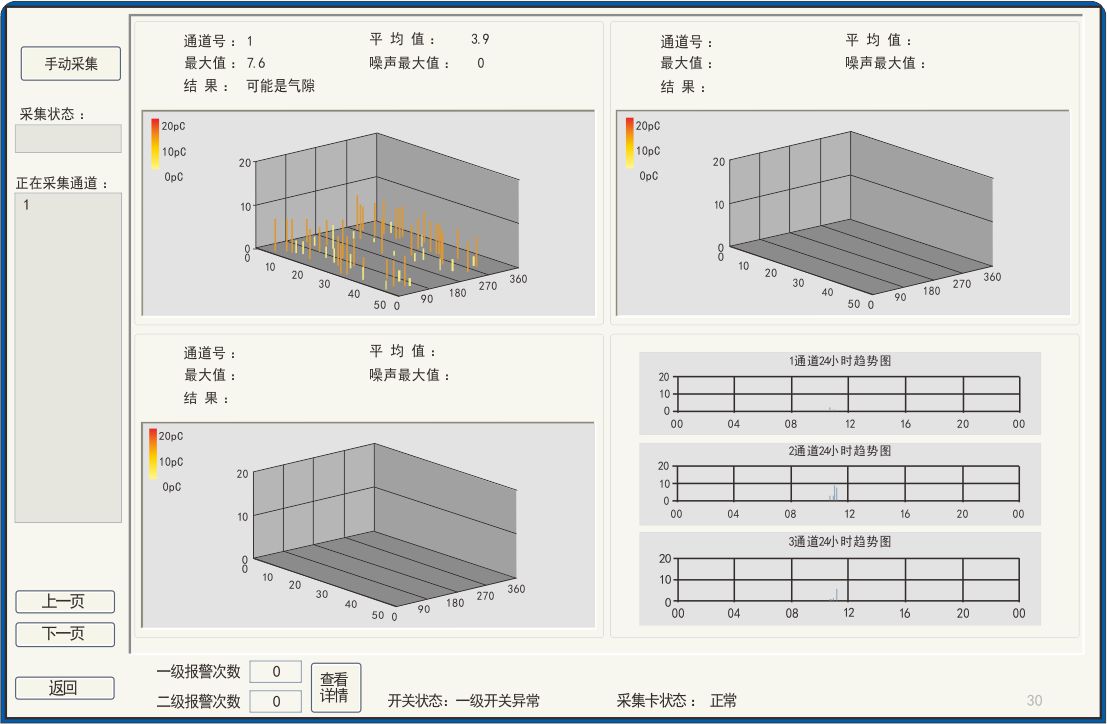 ◆提供历史数据查询、放电发展趋势图、报表和设定报警等功能,可通过纵向(同个传感器在一段时间内的局放水平)和横向对比(相同位置的几个传感器局放水平在同一时间段的比较)相结合,采用逐年监测跟 踪,对其变化率进行分析,从而有效发现GIS绝缘故障。